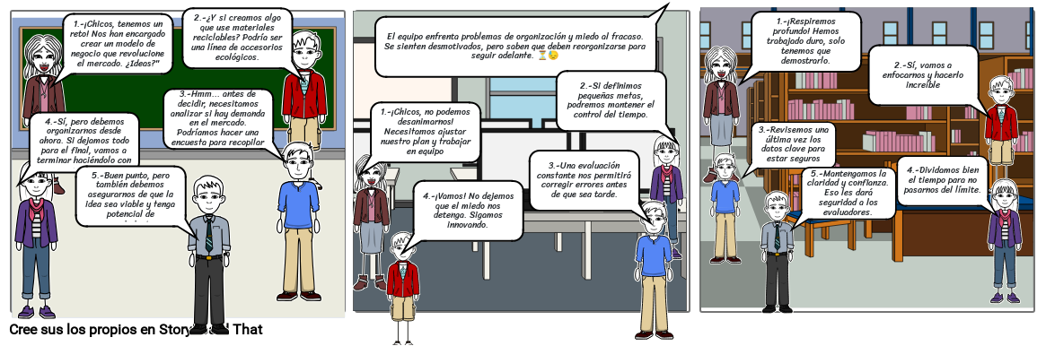 1.-¡Chicos, tenemos un reto! Nos han encargado crear un modelo de negocio que revolucione el mercado. ¿Ideas?"