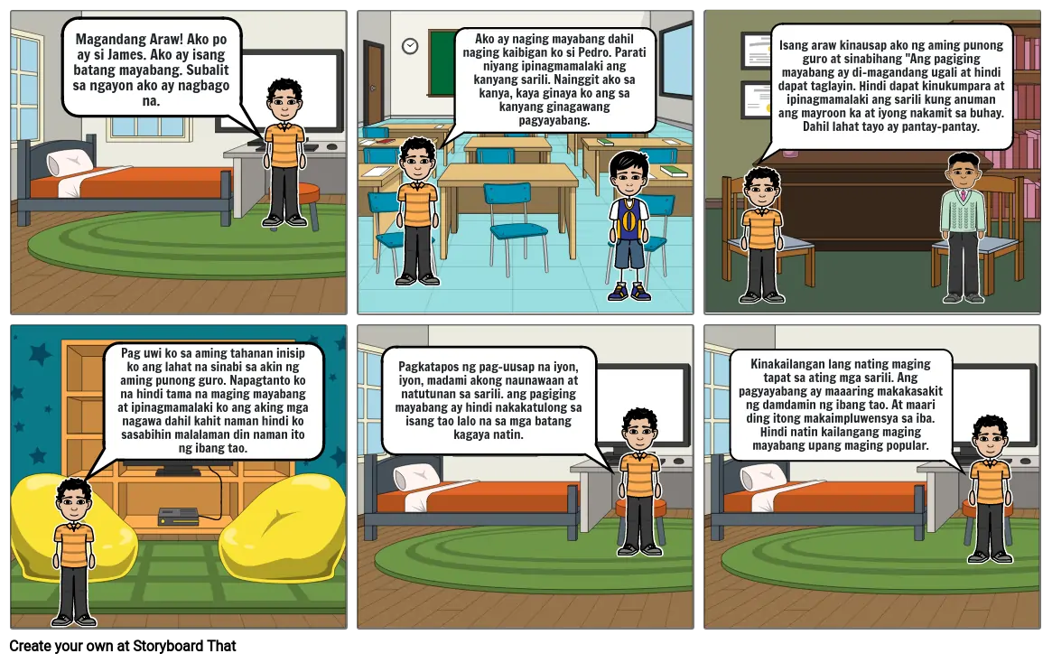 Pag uwi ko sa aming tahanan inisip ko ang lahat na sinabi sa akin ng aming punong guro. Napagtanto ko na hindi tama na maging mayabang at ipinagmamalaki ko ang aking mga nagawa dahil kahit naman hindi ko sasabihin malalaman din naman ito ng ibang tao.