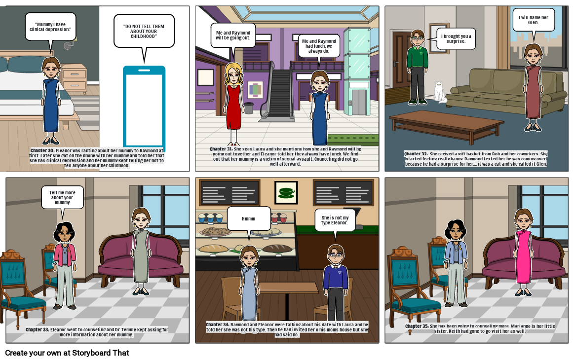 Chapter 31: She sees Laura and she mentions how she and Raymond will be going out together and Eleanor told her they always have lunch. We find out that her mummy is a victim of sexual assault. Counceling did not go well afterward.