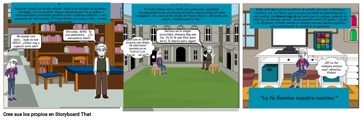 Patio del colegio en un día soleado. Sofía está sentada en un banco, cabizbaja, con su mochila. Parece abrumada por los estudios o preocupaciones personales (podrían verse cuadernos abiertos o una expresión de frustración). El Padre Mateo se acerca a ella, con una expresión amable.