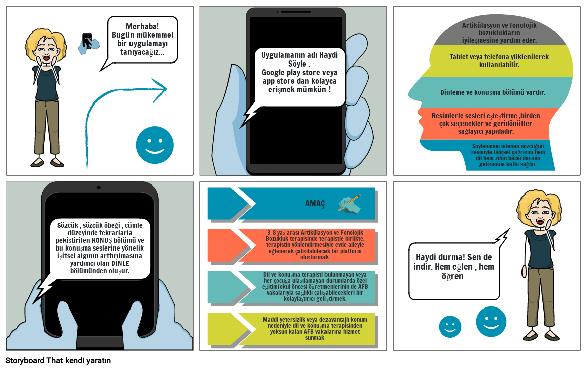 Artikülasyon ve fonolojik bozuklukların iyileşmesine yardım eder. Tablet veya telefona yüklenilerek kullanılabilir. Dinleme ve konuşma bölümü vardır. Resimlerle sesleri eşleştirme ,birden çok seçenekler ve geridönütler sağlayıcı yapıdadır. Söylenmesi istenen sözcüğün resmiyle bilişsel çağrışım hem dil hem zihin becerilerinin gelişimine katkı sağlar.