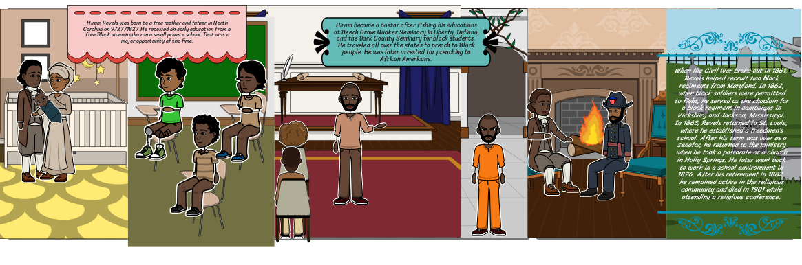 Hiram Revels was born to a free mother and father in North Carolina on 9/27/1827.He received an early education from a free Black women who ran a small private school. That was a major opportunity at the time.