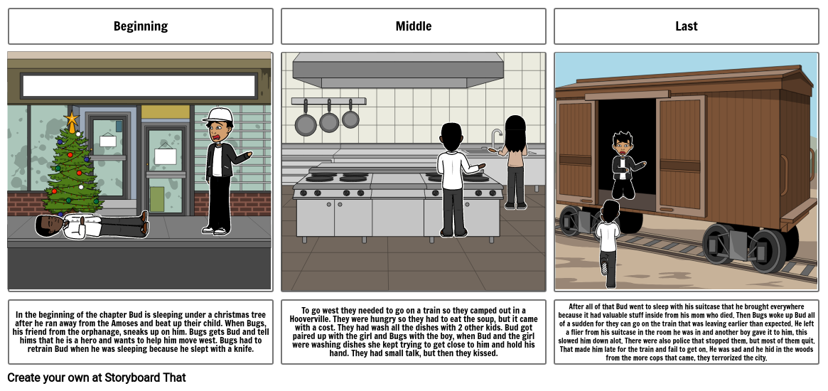 To go west they needed to go on a train so they camped out in a Hooverville. They were hungry so they had to eat the soup, but it came with a cost. They had wash all the dishes with 2 other kids. Bud got paired up with the girl and Bugs with the boy, when Bud and the girl were washing dishes she kept trying to get close to him and hold his hand. They had small talk, but then they kissed.