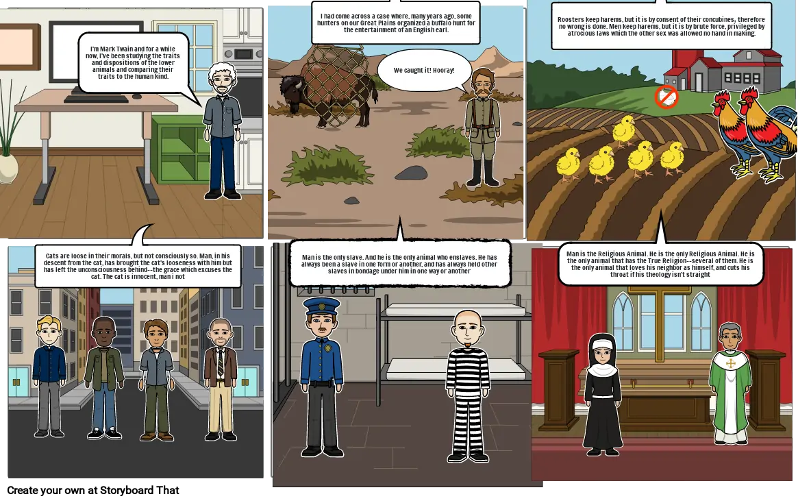I'm Mark Twain and for a while now, I've been studying the traits and dispositions of the "lower animals" and comparing their traits to the human kind.