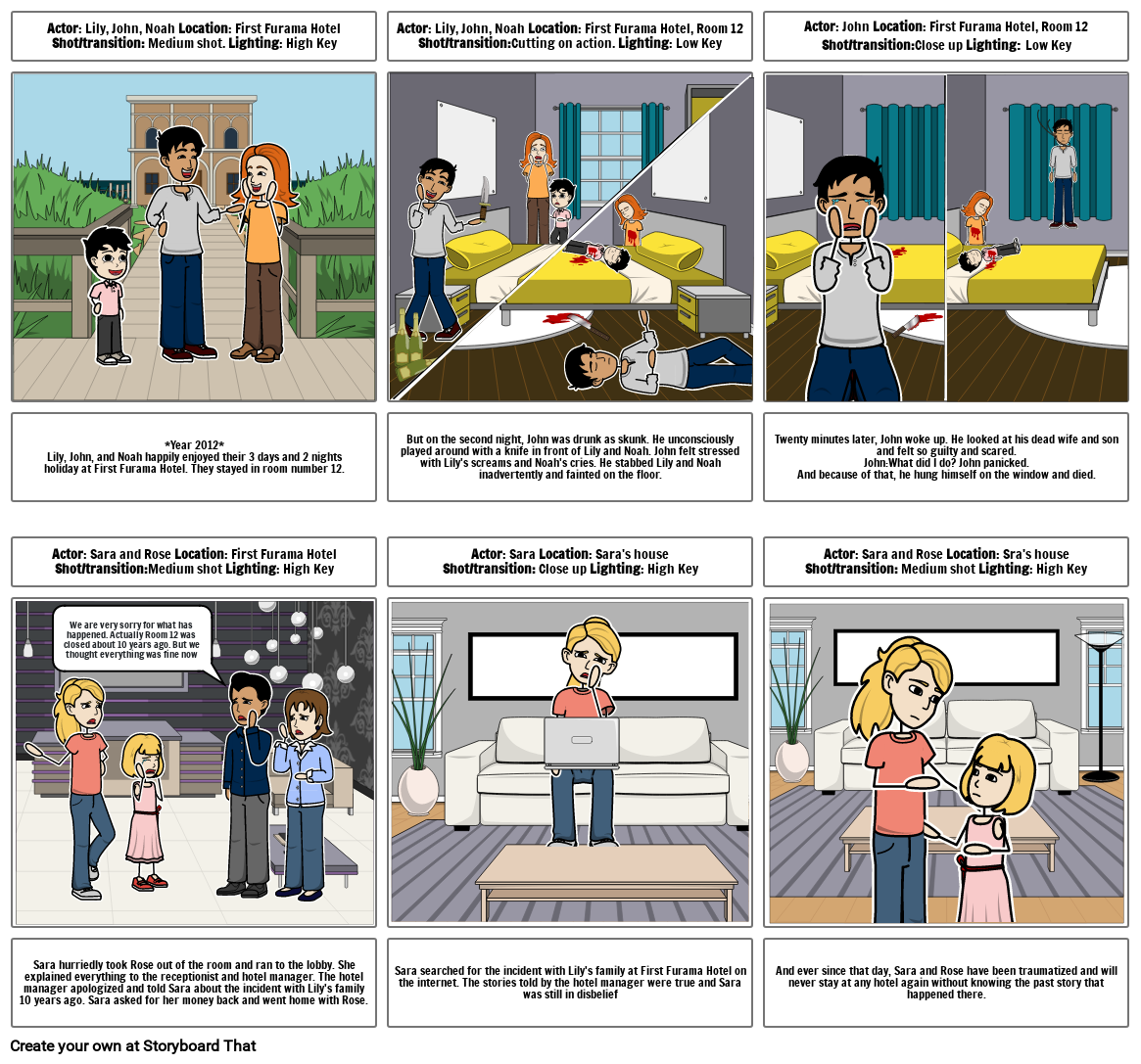 Actor: Lily, John, Noah Location: First Furama Hotel, Room 12Shot/transition:Cutting on action. Lighting: Low Key