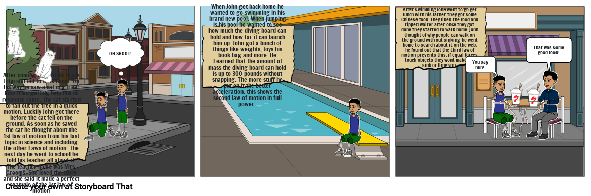 After coming home from track John started to walk home. On his way he saw a cat in a tree! John tried getting help but no response came. The cat started to fall out the tree in a quick motion. Luckily John got there before the cat fell on the ground. As soon as he saved the cat he thought about the 1st law of motion from his last topic in science and including the other Laws of motion. The next day he went to school he told his teacher all about it! The teacher name was Mrs. Grooms. She loved the story and she said it made a perfect example of the 1st law of motion