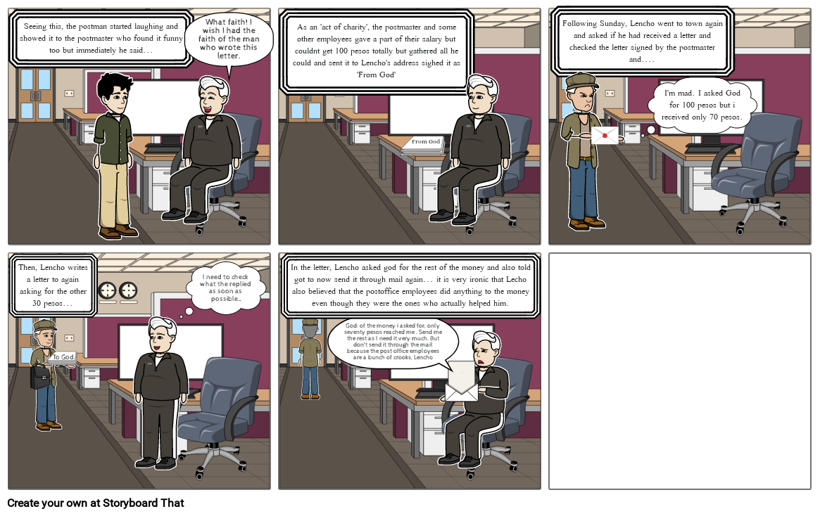 Following Sunday, Lencho went to town again and asked if he had received a letter and checked the letter signed by the postmaster and....