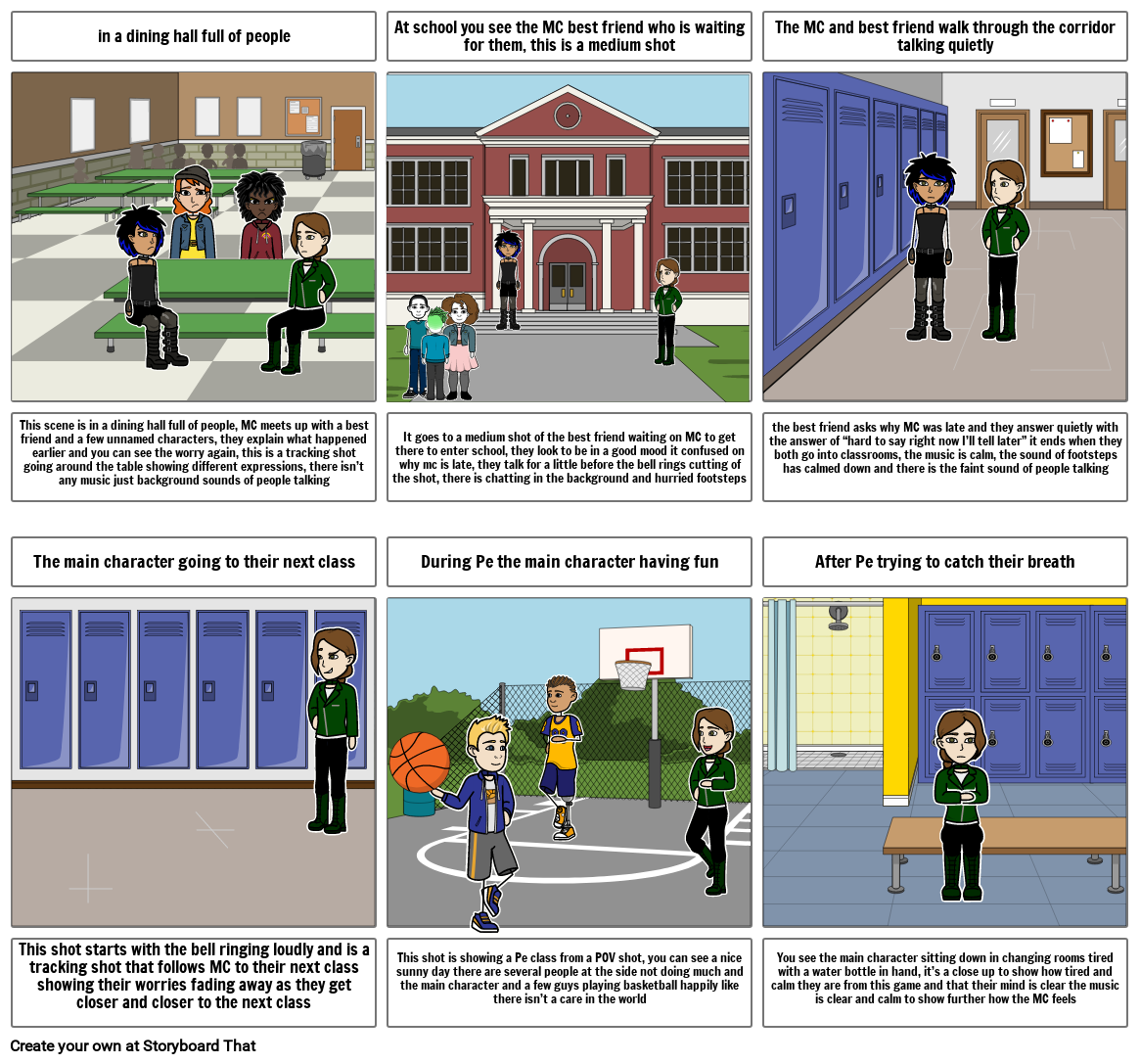 This shot starts with the bell ringing loudly and is a tracking shot that follows MC to their next class showing their worries fading away as they get closer and closer to the next class