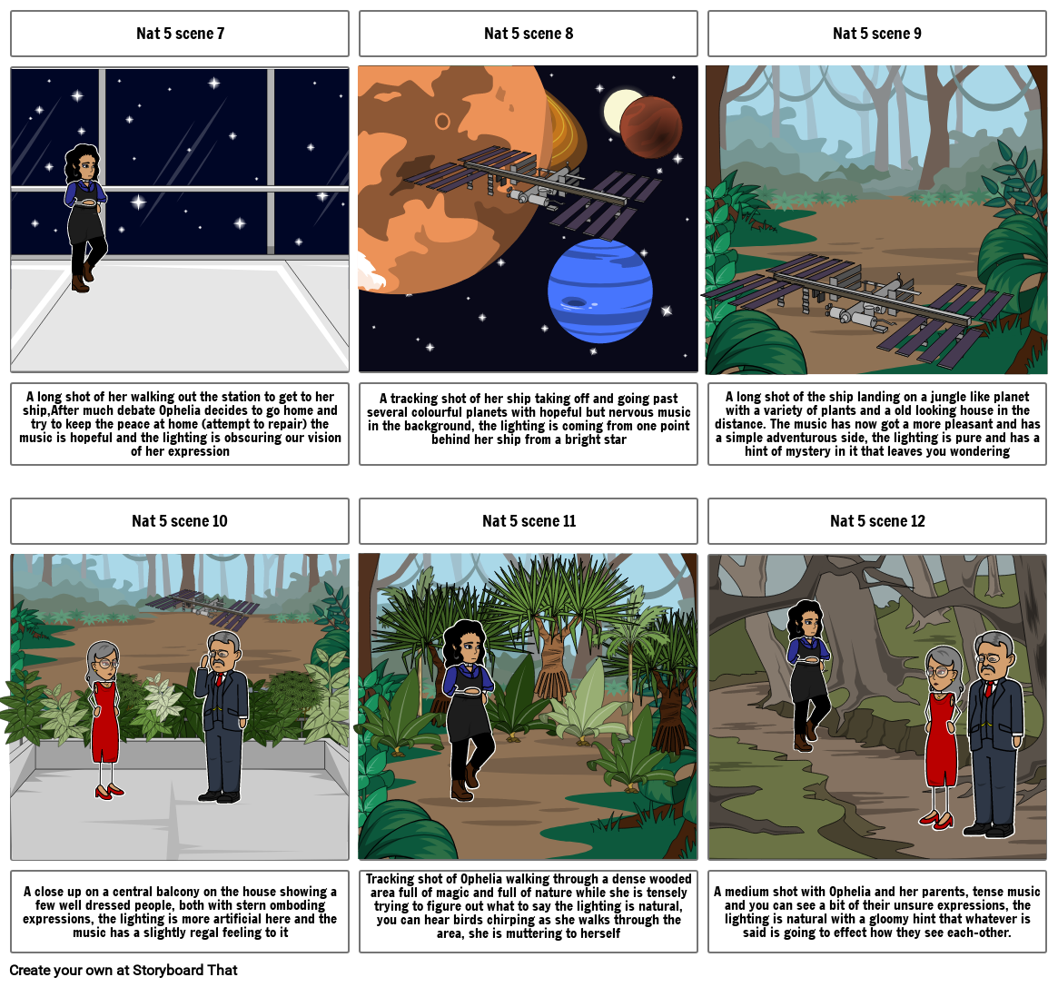 A medium shot with Ophelia and her parents, tense music and you can see a bit of their unsure expressions, the lighting is natural with a gloomy hint that whatever is said is going to effect how they see each-other.