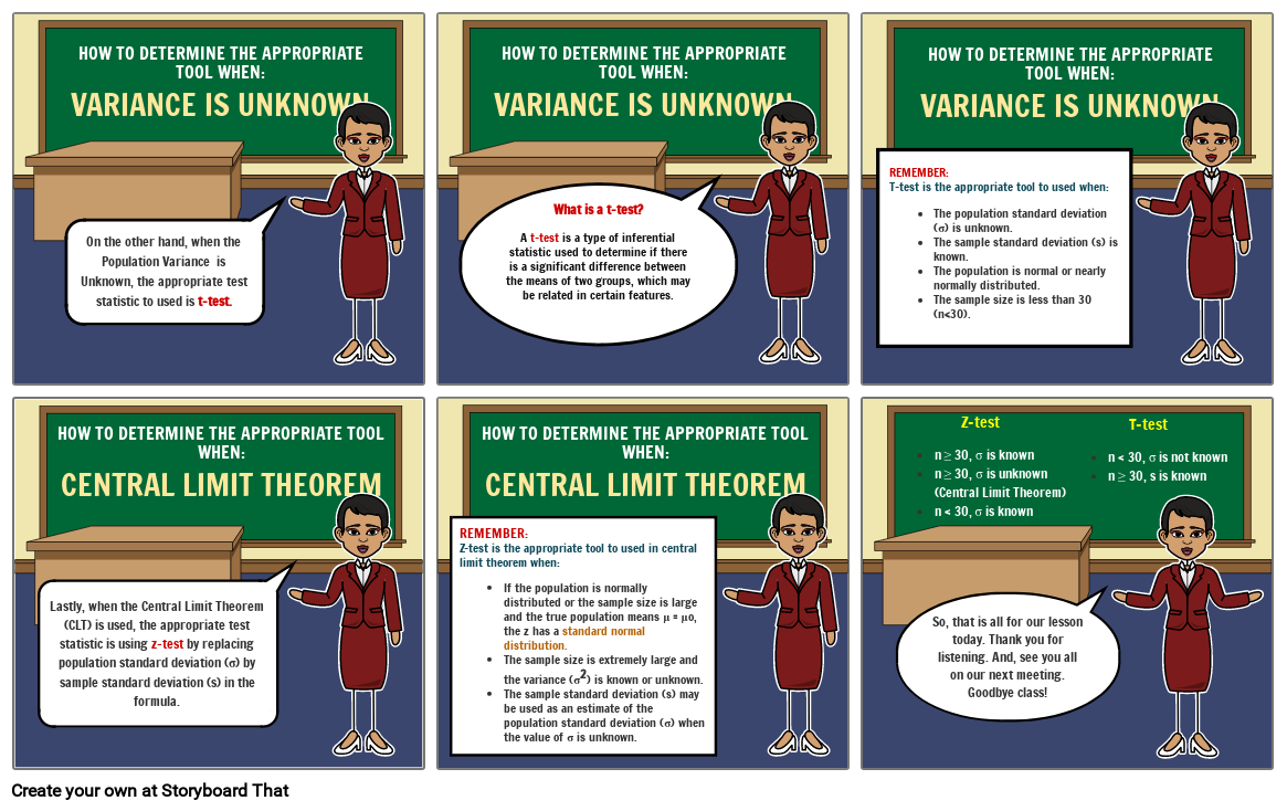 REMEMBER:Z-test is the appropriate tool to used in central limit theorem when:If the population is normally distributed or the sample size is large and the true population means μ = μo, the z has a standard normal distribution.The sample size is extremely large and the variance (σ2) is known or unknown.The sample standard deviation (s) may be used as an estimate of the population standard deviation (σ) when the value of σ is unknown.