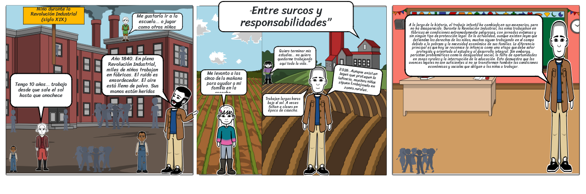 A lo largo de la historia, el trabajo infantil ha cambiado en sus escenarios, pero no ha desaparecido. Durante la Revolución Industrial, los niños trabajaban en fábricas en condiciones extremadamente peligrosas, con jornadas extensas y sin ningún tipo de protección legal. En la actualidad, aunque existen leyes que defienden los derechos de los niños, muchos siguen trabajando en el campo debido a la pobreza y la necesidad económica de sus familias. La diferencia principal es que hoy se reconoce la infancia como una etapa que debe estar protegida y orientada al estudio y al desarrollo integral. Sin embargo, persisten problemáticas como la desigualdad social, la falta de oportunidades en zonas rurales y la interrupción de la educación. Esto demuestra que los avances legales no son suficientes si no se transforman también las condiciones económicas y sociales que obligan a los niños a trabajar.
