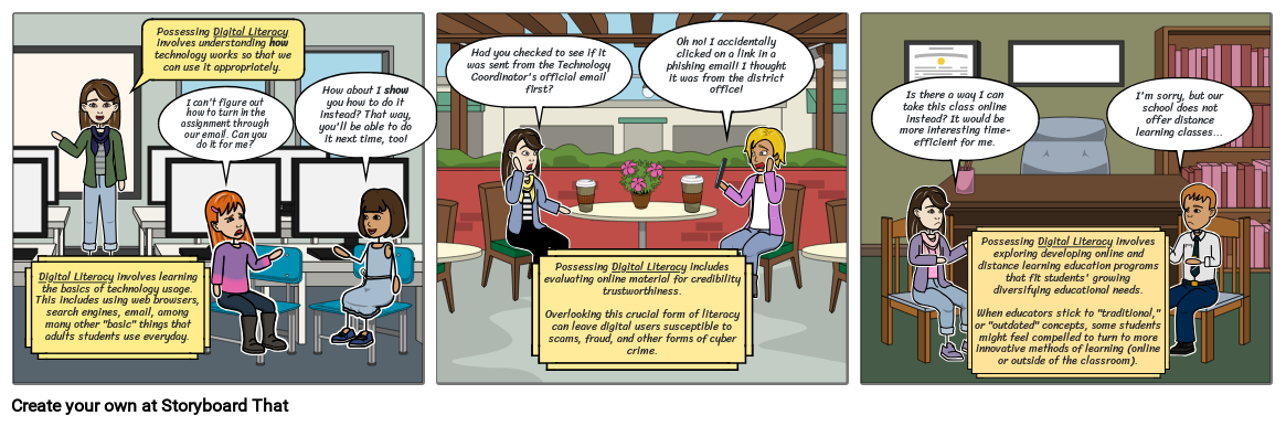 Possessing Digital Literacy involves exploring developing online and distance learning education programs that fit students' growing diversifying educational needs.When educators stick to "traditional," or "outdated" concepts, some students might feel compelled to turn to more innovative methods of learning (online or outside of the classroom).
