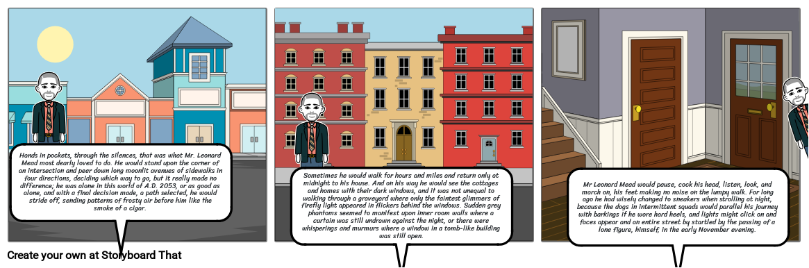 Hands in pockets, through the silences, that was what Mr. Leonard Mead most dearly loved to do. He would stand upon the corner of an intersection and peer down long moonlit avenues of sidewalks in four directions, deciding which way to go, but it really made no difference; he was alone in this world of A.D. 2053, or as good as alone, and with a final decision made, a path selected, he would stride off, sending patterns of frosty air before him like the smoke of a cigar.