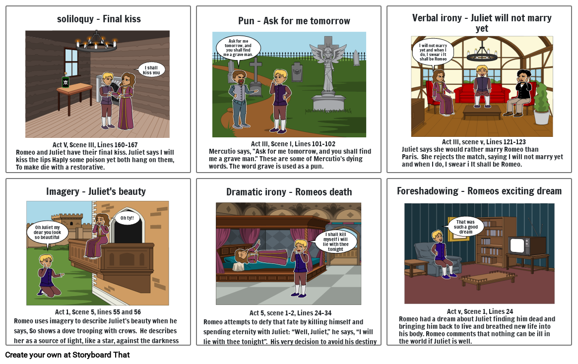 Act 1, Scene 5, lines 55 and 56Romeo uses imagery to describe Juliet's beauty when he says, So shows a dove trooping with crows.  He describes her as a source of light, like a star, against the darkness