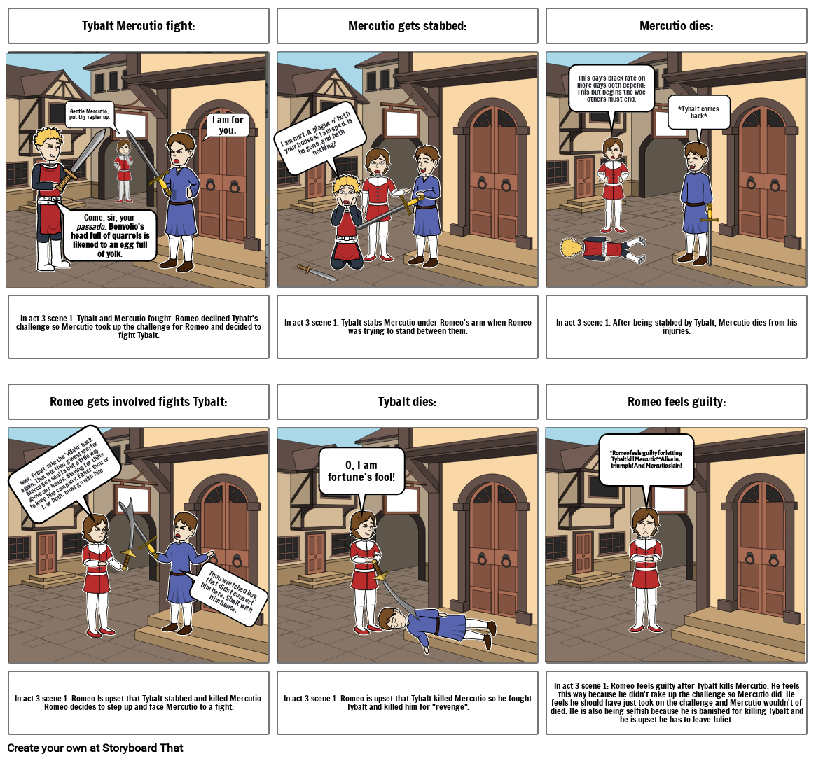 In act 3 scene 1: Romeo Is upset that Tybalt stabbed and killed Mercutio. Romeo decides to step up and face Mercutio to a fight.