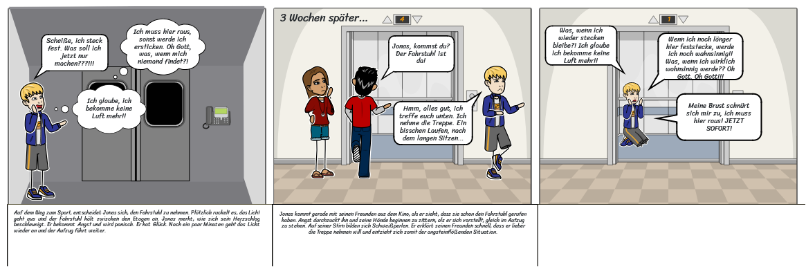 Auf dem Weg zum Sport, entscheidet Jonas sich, den Fahrstuhl zu nehmen. Plötzlich ruckelt es, das Licht geht aus und der Fahrstuhl hält zwischen den Etagen an. Jonas merkt, wie sich sein Herzschlag beschleunigt. Er bekommt Angst und wird panisch. Er hat Glück. Nach ein paar Minuten geht das Licht wieder an und der Aufzug fährt weiter.