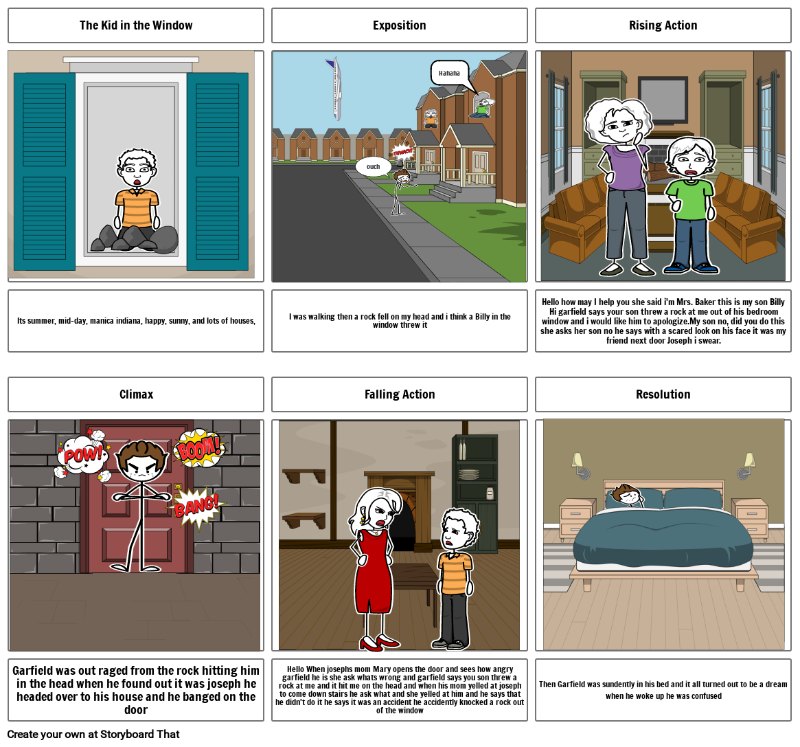 "Hello how may I help you she said i'm Mrs. Baker this is my son Billy" Hi garfield says your son threw a rock at me out of his bedroom window and i would like him to apologize."My son no, did you do this she asks her son no he says" "with a scared look on his face it was my friend next door Joseph i swear."