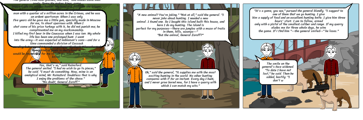 "A new animal? You're joking." "Not at all," said the general. "I never joke about hunting. I needed a newanimal. I found one. So I bought this island built this house, and here I do my hunting. The island isperfect for my purposes--there are jungles with a maze of traits in them, hills, swamps--""But the animal, General Zaroff?"