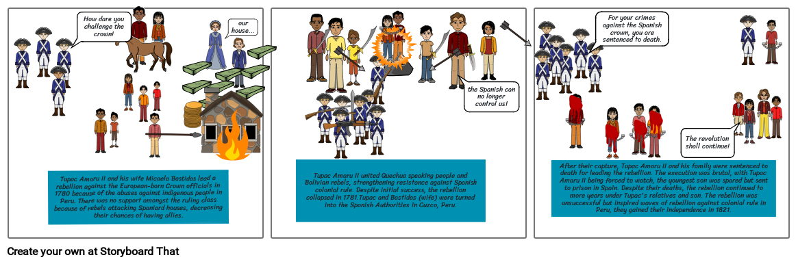 After their capture, Tupac Amaru II and his family were sentenced to death for leading the rebellion. The execution was brutal, with Tupac Amaru II being forced to watch, the youngest son was spared but sent to prison in Spain. Despite their deaths, the rebellion continued to more years under Tupac's relatives and son. The rebellion was unsuccessful but inspired waves of rebellion against colonial rule in Peru, they gained their independence in 1821.