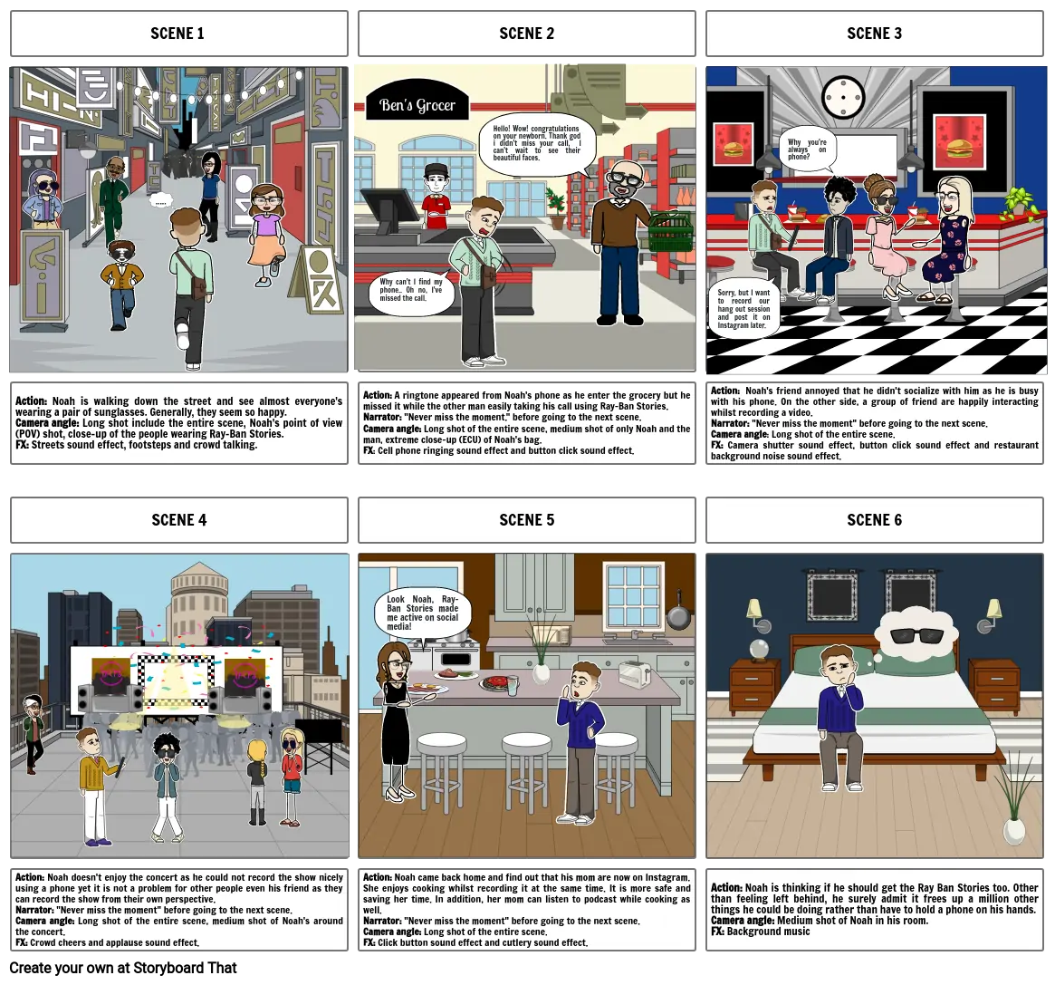 Action: Noah's friend annoyed that he didn't socialize with him as he is busy with his phone. On the other side, a group of friend are happily interacting whilst recording a video.Narrator: "Never miss the moment" before going to the next scene.Camera angle: Long shot of the entire scene.FX: Camera shutter sound effect, button click sound effect and restaurant background noise sound effect.