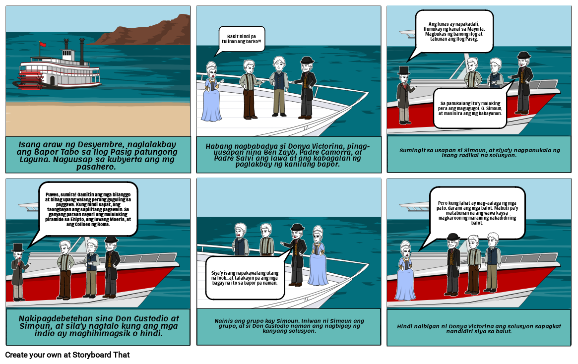 Isang araw ng Desyembre, naglalakbay ang Bapor Tabo sa Ilog Pasig patungong Laguna. Naguusap sa kubyerta ang mg pasahero.