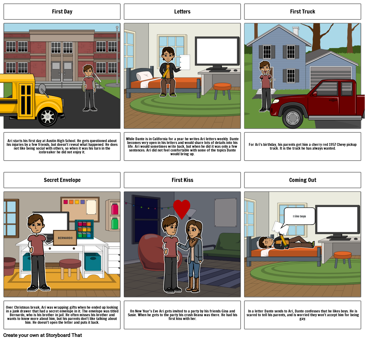 While Dante is in California for a year he writes Ari letters weekly. Dante becomes very open in his letters and would share lots of details into his life. Ari would sometimes write back, but when he did it was only a few sentences. Ari did not feel comfortable with some of the topics Dante would bring up.