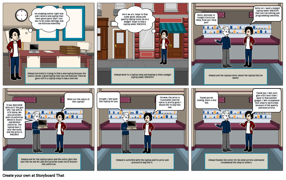 Ahmad currently is trying to find a new laptop because his course needs a good laptop that can run Autocad. Then he goes out to a laptop shop to buy a new one.