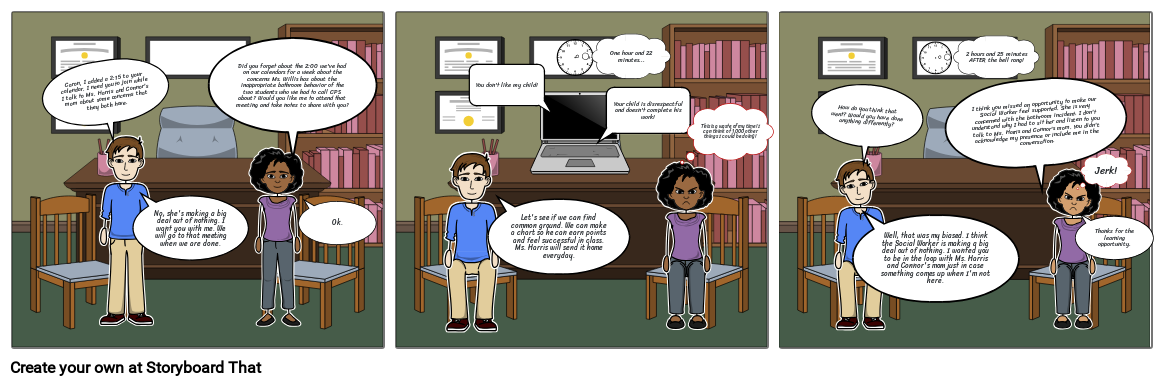 I think you missed an opportunity to make our Social Worker feel supported. She is very concerned with the bathroom incident. I don't understand why I had to sit her and listen to you talk to Ms. Harris and Connor's mom. You didn't acknowledge my presence or include me in the conversation.