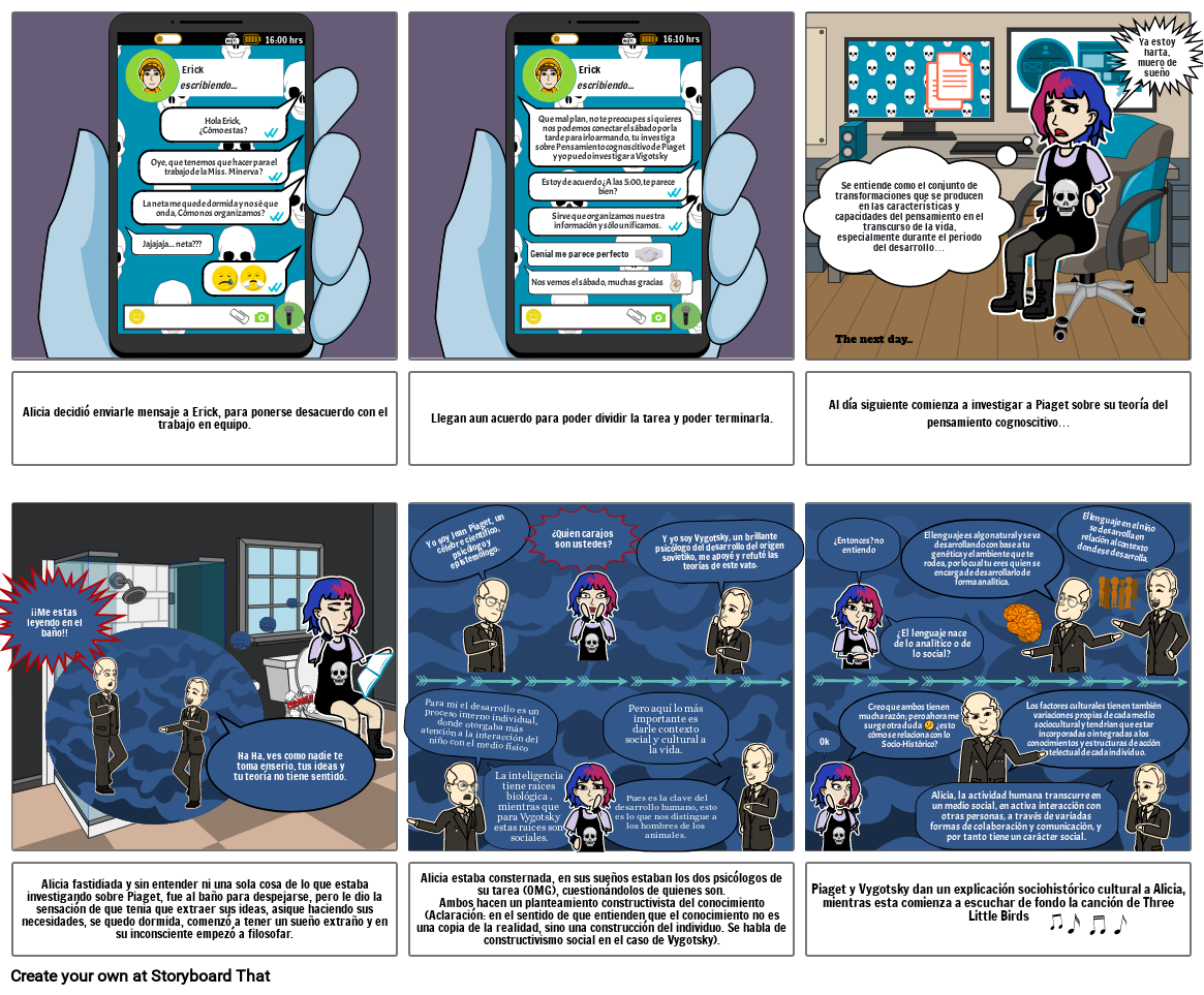 Alicia estaba consternada, en sus sueños estaban los dos psicólogos de su tarea (OMG), cuestionándolos de quienes son.Ambos hacen un planteamiento constructivista del conocimiento (Aclaración: en el sentido de que entienden que el conocimiento no es una copia de la realidad, sino una construcción del individuo. Se habla de constructivismo social en el caso de Vygotsky).