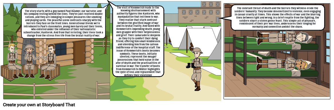 The story starts with a guy named Paul Bäumer, our narrator, and his company resting behind the lines. They've just received double rations, and they are indulging in simple pleasures like smoking and playing cards. The peaceful scene contrasts sharply with the horrors they face on the front lines. Generational Divide we're introduced to Paul's classmates, young men barely out their teens, who enlisted under the influence of their nationalistic schoolteacher, Kantorek. And from that in listing, their lives took a change from the stress free life from the brutal reality of war.