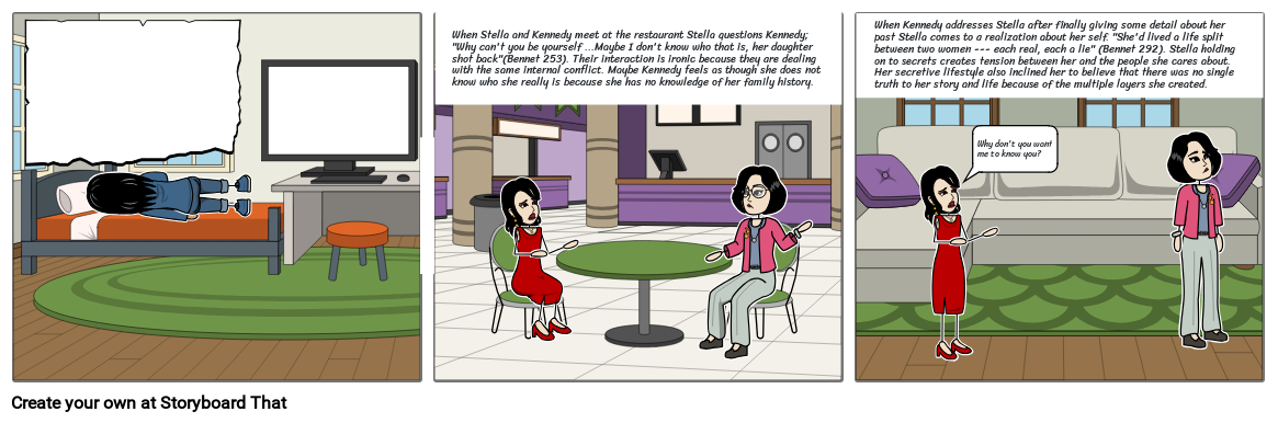 When Stella and Kennedy meet at the restaurant Stella questions Kennedy; "Why can't you be yourself ...Maybe I don't know who that is, her daughter shot back"(Bennet 253). Their interaction is ironic because they are dealing with the same internal conflict. Maybe Kennedy feels as though she does not know who she really is because she has no knowledge of her family history.