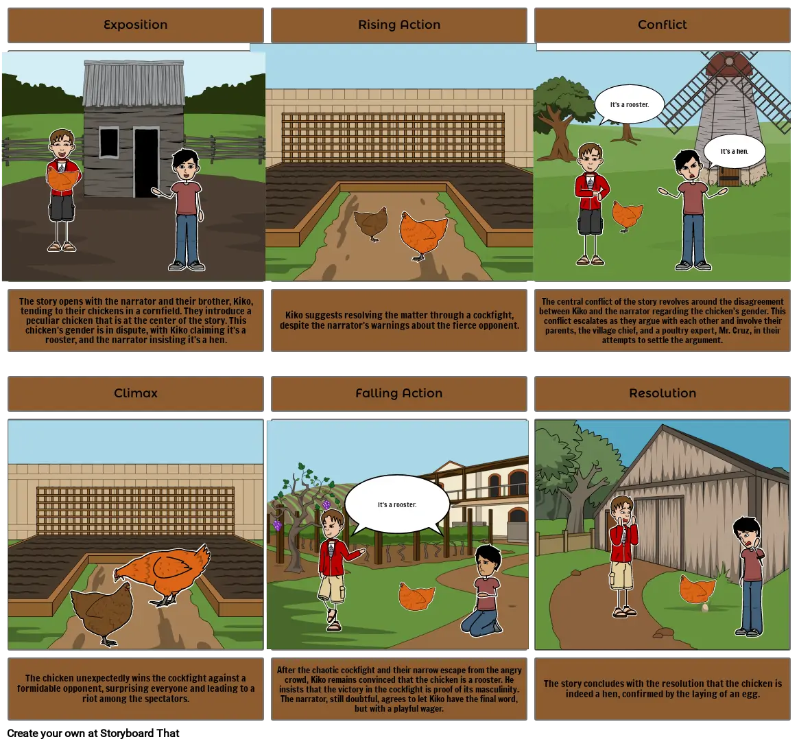 After the chaotic cockfight and their narrow escape from the angry crowd, Kiko remains convinced that the chicken is a rooster. He insists that the victory in the cockfight is proof of its masculinity. The narrator, still doubtful, agrees to let Kiko have the final word, but with a playful wager.