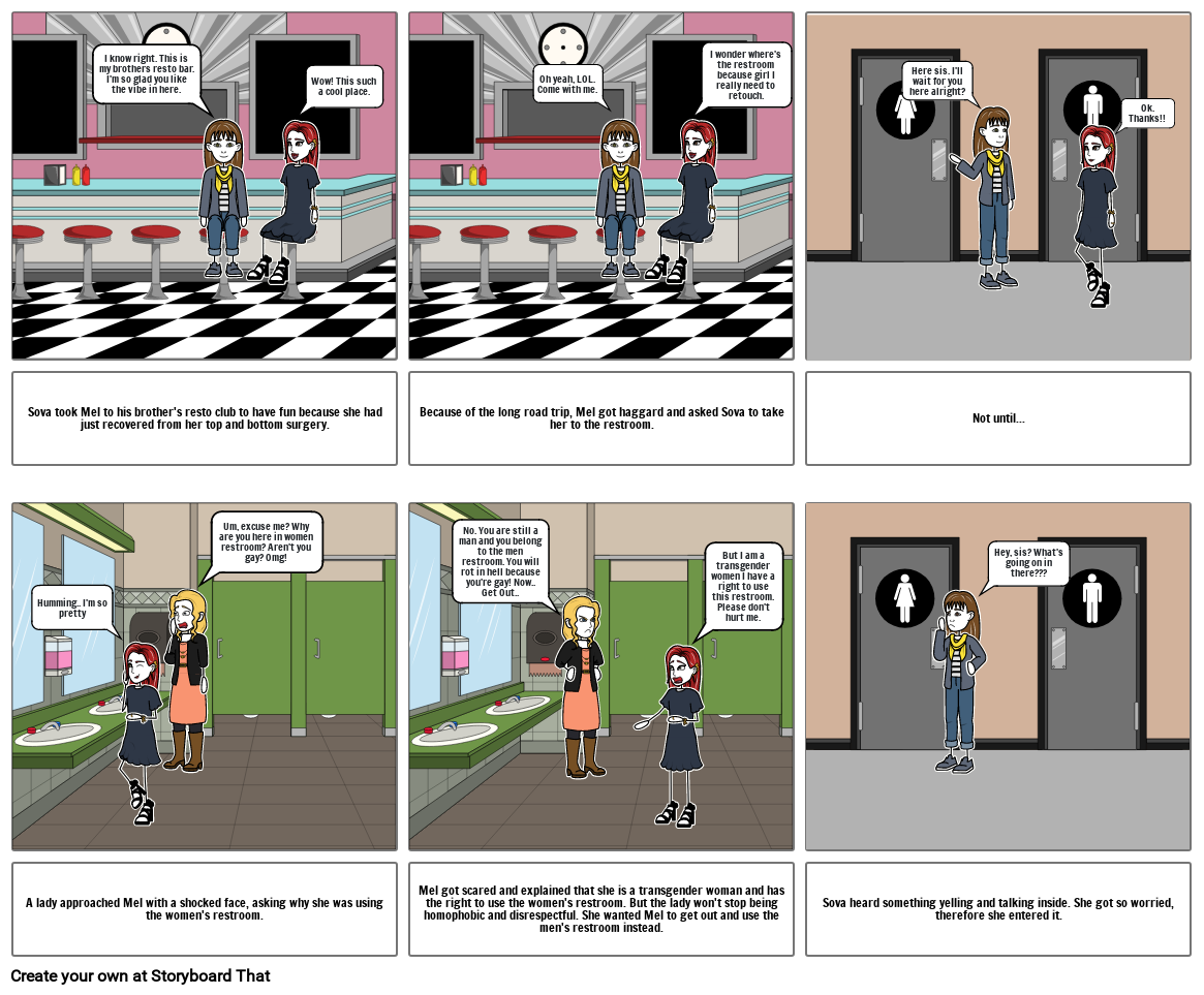 Mel got scared and explained that she is a transgender woman and has the right to use the women's restroom. But the lady won't stop being homophobic and disrespectful. She wanted Mel to get out and use the men's restroom instead.