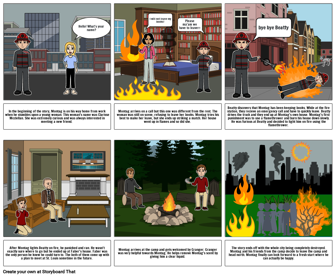 Montag arrives on a call but this one was different from the rest. The woman was still on scene, refusing to leave her books. Montag tries his best to make her leave, but she ends up striking a match. Her house went up in flames and so did she.