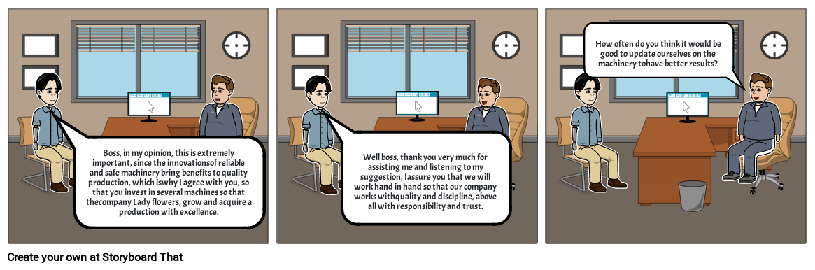 Well boss, thank you very much for assisting me and listening to my suggestion, Iassure you that we will work hand in hand so that our company works withquality and discipline, above all with responsibility and trust.