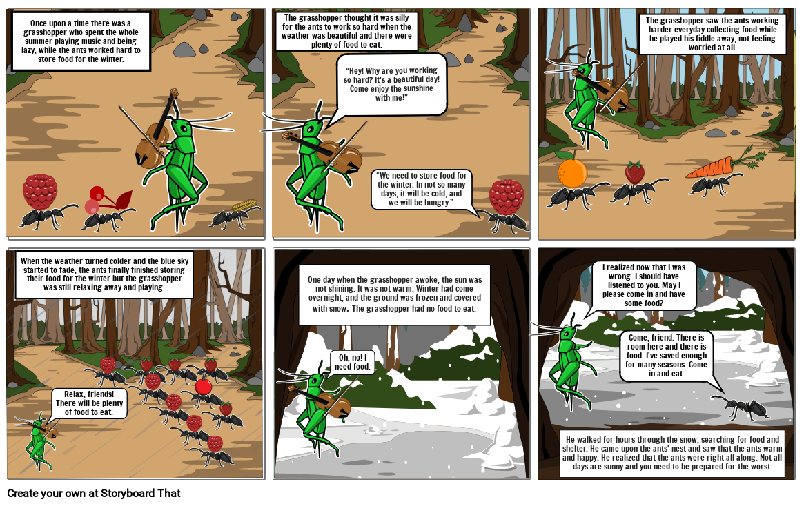 He walked for hours through the snow, searching for food and shelter. He came upon the ants' nest and saw that the ants warm and happy. He realized that the ants were right all along. Not all days are sunny and you need to be prepared for the worst.