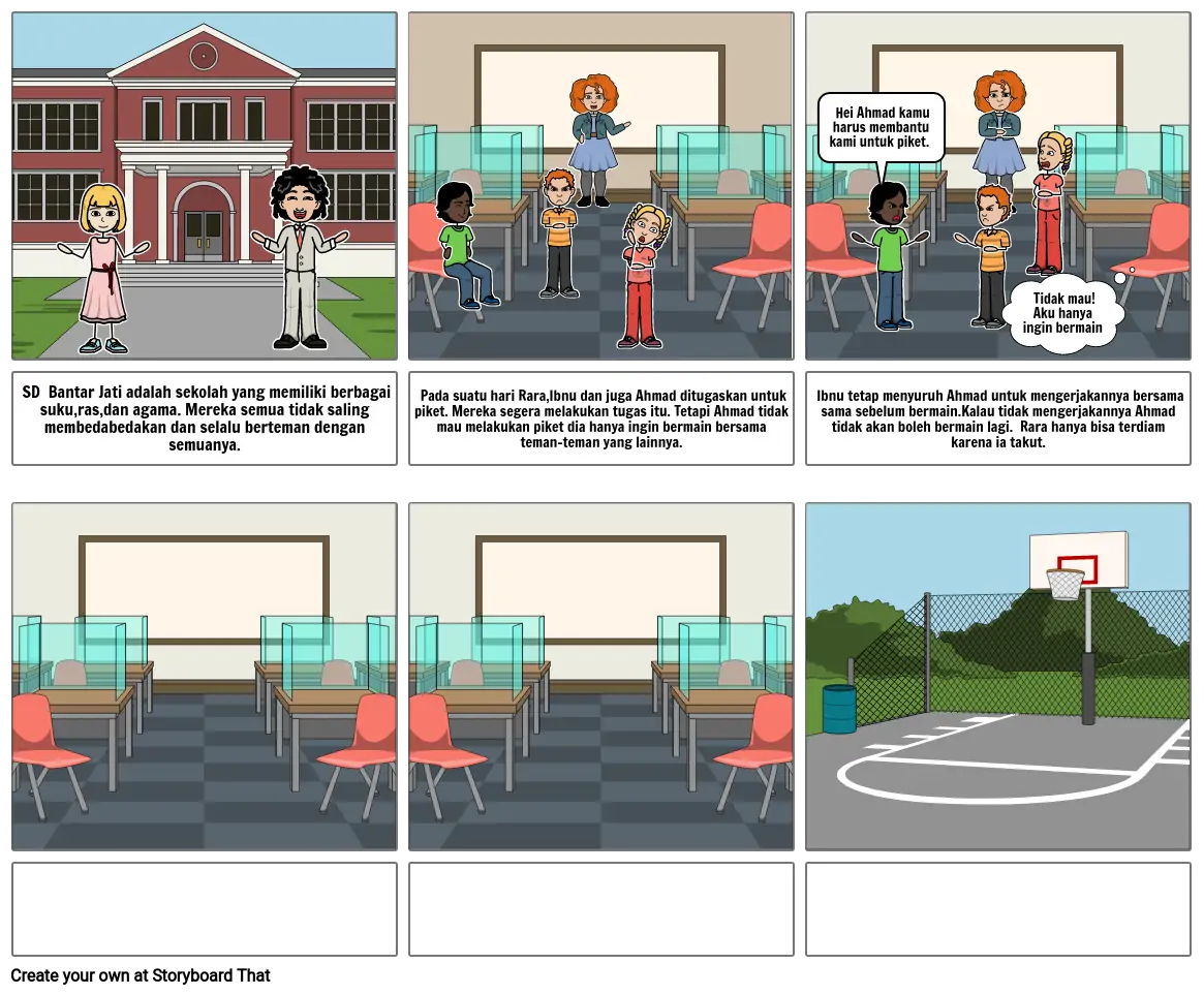 Pada suatu hari Rara,Ibnu dan juga Ahmad ditugaskan untuk piket. Mereka segera melakukan tugas itu. Tetapi Ahmad tidak mau melakukan piket dia hanya ingin bermain bersama teman-teman yang lainnya.