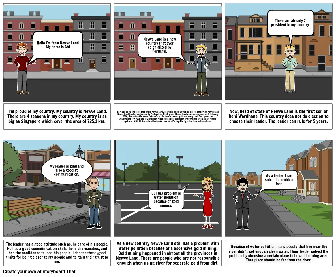 There are so many people that live in Newve Land. There are about 50 million people that live in Newve Land. Newve Land has been colonized by Portugal for 10-20 years. Newve Land was independence on 3 February 2010. Newve Land is also a rich country. We have a spices, gold, and many coal. The type of the government of Newveland is Democracy republic The first president of Newveland was Deni wardhana syahrani. At 2009 Newve Land had a civil war with Portugal to fight for their independence.