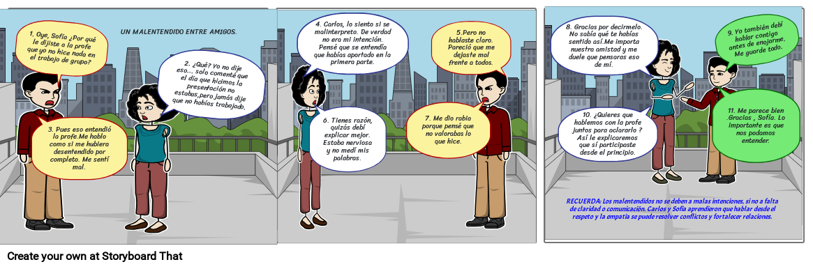 RECUERDA: Los malentendidos no se deben a malas intenciones, si no a falta de claridad o comunicación. Carlos y Sofía aprendieron que hablar desde el respeto y la empatía se puede resolver conflictos y fortalecer relaciones.