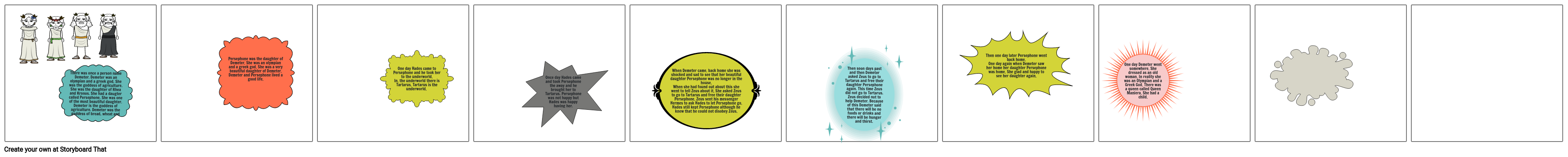 One day Hades came to Persephone and he took her to the underworld. In. the underworld there is Tartarus. Tartarus is the underworld.