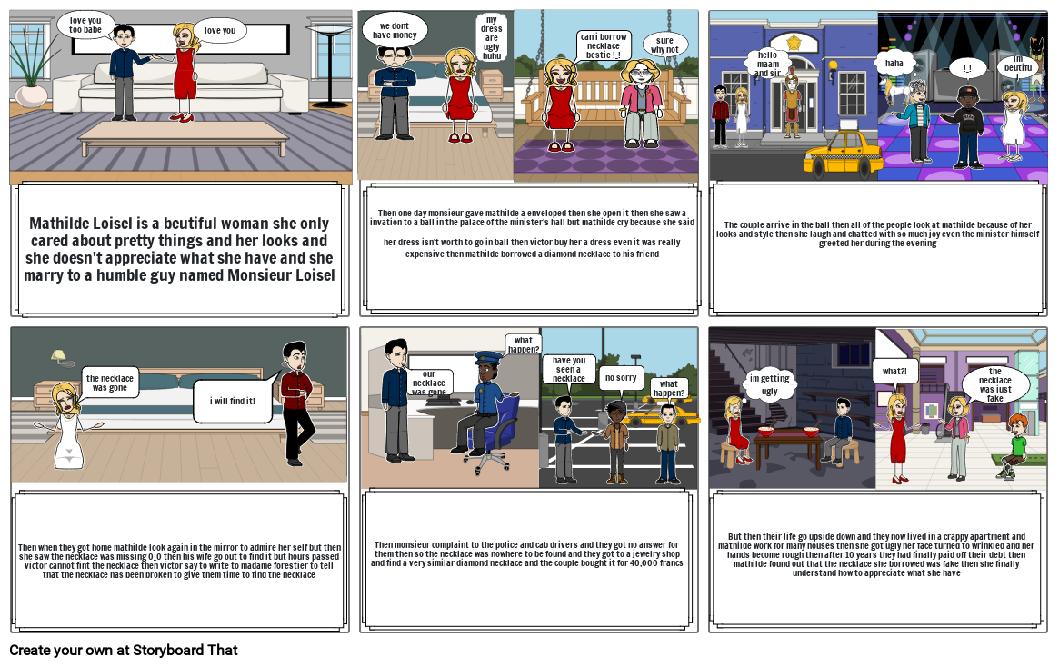 Then one day monsieur gave mathilde a enveloped then she open it then she saw a invation to a ball in the palace of the minister's hall but mathilde cry because she said her dress isn't worth to go in ball then victor buy her a dress even it was really expensive then mathilde borrowed a diamond necklace to his friend