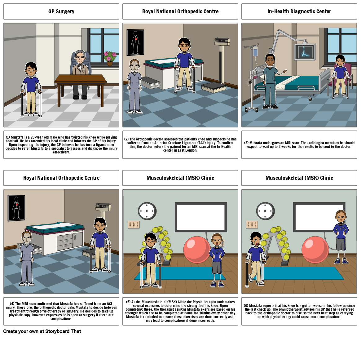 (6) Mustafa reports that his knee has gotten worse in his follow up since the last check up. The physiotherapist advises his GP that he is referred back to the orthopedic doctor to discuss the next best step as carrying on with physiotherapy could cause more complications.