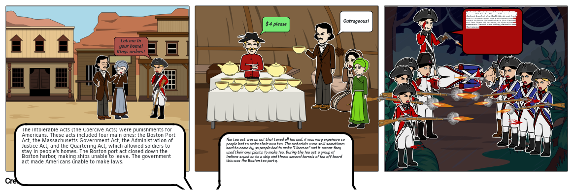 The Intolerable Acts (the Coercive Acts) were punishments for Americans. These acts included four main ones: the Boston Port Act, the Massachusetts Government Act, the Administration of Justice Act, and the Quartering Act, which allowed soldiers to stay in people's homes. The Boston port act closed down the Boston harbor, making ships unable to leave. The government act made Americans unable to make laws.