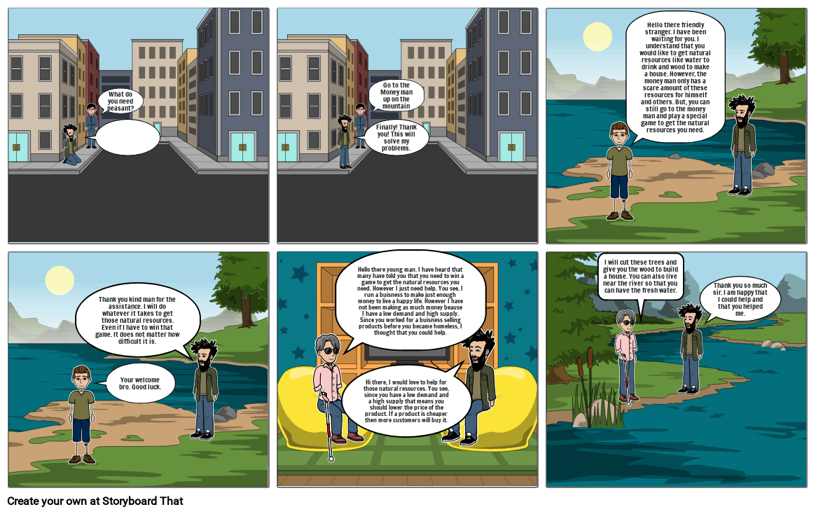 Hello there friendly stranger. I have been waiting for you. I understand that you would like to get natural resources like water to drink and wood to make a house. However, the money man only has a scare amount of these resources for himself and others. But, you can still go to the money man and play a special game to get the natural resources you need.