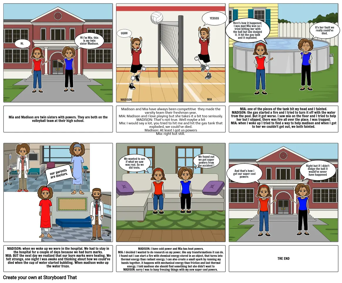 Madison and Mia have always been competitive they made the varsity team their freshman year. MIA: Madison and I love playing but she takes it a bit too seriously. MADISON: That's not true. Well maybe a bitMIa: I would say a lot, you tried to hit me and hit the gas tank that exploded, we could've died. Madison: At least I got us powers MIa: right but still.