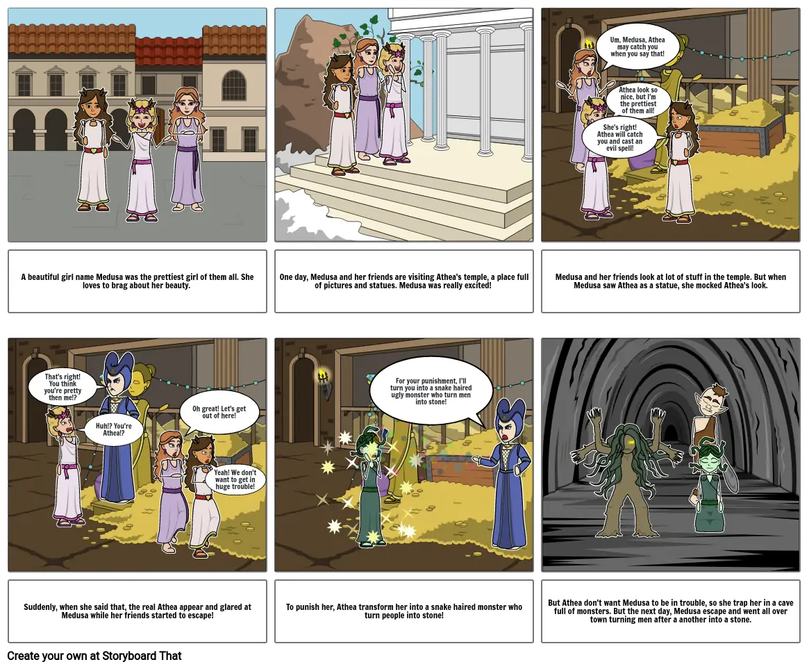 Medusa and her friends look at lot of stuff in the temple. But when Medusa saw Athea as a statue, she mocked Athea's look.