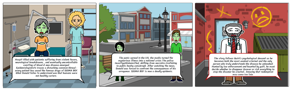 Hospit filled with patients suffering from violent fevers, neurological breakdrowns , and eventually uncontrollable vomiting of blood.A new disease emerged. Epidemiologistists traces a disturbing common thread : every patient has ussed the famous drugs of SIGMA BOY. What Donald failes to understand was that humans were not healthy cariers.