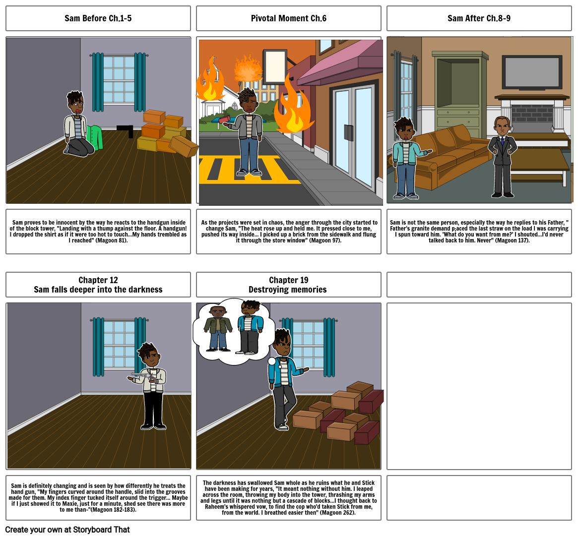 The darkness has swallowed Sam whole as he ruins what he and Stick have been making for years, "It meant nothing without him. I leaped across the room, throwing my body into the tower, thrashing my arms and legs until it was nothing but a cascade of blocks...I thought back to Raheem's whispered vow, to find the cop who'd taken Stick from me, from the world. I breathed easier then" (Magoon 262).