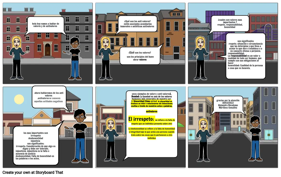 unos ejemplos de valore y anti valores1. Bondad: La bondad es uno de los valores humanos más generales de nuestro ser.2. Sinceridad Cómo virtud, la sinceridad se traduce en vivir y relacionarse sin intenciones ocultas a través de nuestros actos o palabras.antivaloresEl irrespeto: se refiere a la falta de respeto que un individuo presenta sobre otroLa deshonestidad se refiere a la falta de honestidad e integridad bajo la que actúa una persona cuando trata sobre las cosas que le pertenecen a otro individuo