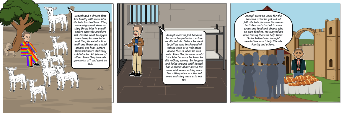 Joseph had a dream that his family will serve him. He told his brothers. They were angry and envy so they threw him in a well. Before that the brothers not Joseph went to egyet then Joseph came later and they threw him in a well and there dad a wild animal ate him. Before they told there dad they sold him for 20 pieces of silver Then they tore his garments off and went to jail.